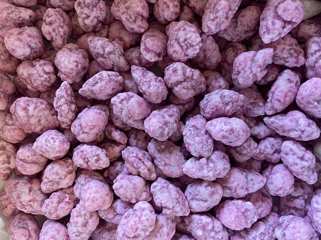 最後に香料とアラビアゴムを混ぜたものを加え、表面を艶掛けし、味をつけます。バーバ・パパ味とすみれ味の2種類仕上げです。バーバ・パパといえば多くの人はピンクのあのキャラクターをイメージすると思いますが、実はわたあめの事なんです!