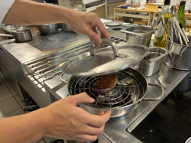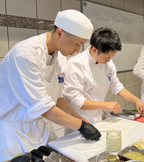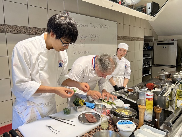 今回はジャック・デコレ氏と、従業員として働いているフランス校卒業生と現在の研修生に来ていただき、前菜料理と肉料理の2品を作っていただきました。