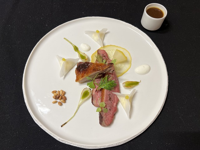 カモの焼き具合がとってもきれいなロゼ色で、鴨を活かす酸味と甘みのあるパーツを盛りつけられています。