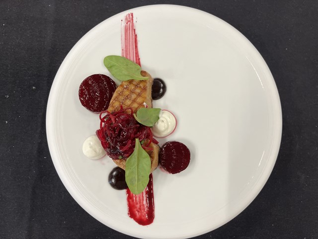 ビーツの新芽を飾りに使い、盛りつけていきます。形を変えたビーツの鮮やかな色が印象的な仕上がりになっています。