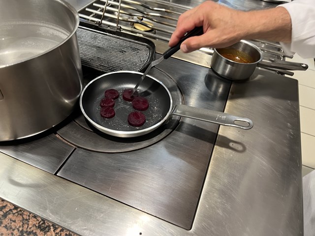 まずはビーツを皮つきのまま丸ごとアルミホイルで包んで160℃のオーブンでローストします。火が通ったら皮をむき、厚みを揃えてカットし、2種類の大きさの丸い型で抜きます。くるみ油で表面を焼き、鶏ガラでとったソースを加えて照り焼きのように仕上げます。 次に生のビーツを専用の器具を使ってせん切りにし、シブレットのみじん切りとすりおろしたレモンの皮を混ぜておきます。