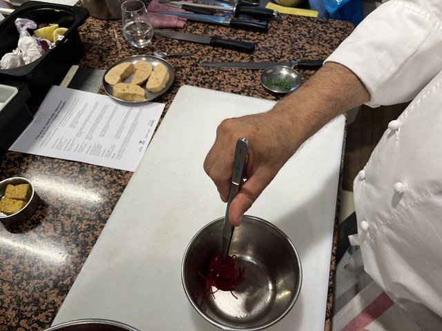 1つ目は生のビーツのジュースを軽く煮詰め、コーンスターチで濃度をつけて塩、こしょう、シェリー酒酢で味を調えます。そこにくるみ油を少しずつ加えながら混ぜてドレッシングを作ります。