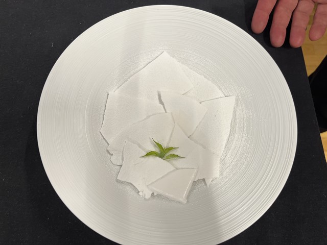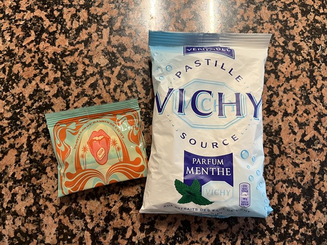 次はパスティーユ・ドゥ・ヴィシーを使ったレストランデザートです。パスティーユ・ドゥ・ヴィシーとは、優しい甘さとさわやかさが楽しめるミントタブレットです。スーパーでも簡単に手に入り、フランスでは人気のお菓子です。誕生してから今年でちょうど200年ということでヴィシーの街も盛り上がっていますが、レストランでもそれを記念したデザートを提供しています。