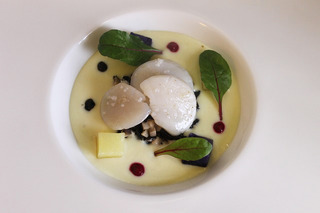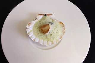 帆立貝をフライパンでソテーし、帆立貝のひもで取った出し汁のソース、ポロねぎのソテーを殻に盛り付けた温かい料理です。