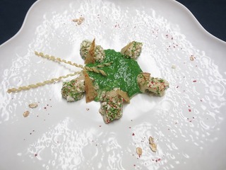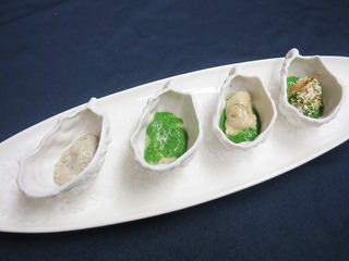 牡蠣をテーマに創世記と題されて考案された料理です。牡蠣といえばブルターニュ、地域で相性の良い食材を厳選してライ麦パンからイメージしてporridgeという粥状のもの。味と彩りのアクセントとしてlaitueピューレ、風味と食感を出したくて生のブロッコリー、カリフラワー、ピンクペッパーを刻んだものをまぶすなど、牡蠣料理の最終形になるまでの過程も一緒に皿に表現しています。
