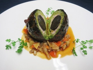 トリュフ丸ごと1個使った料理です。トリュフを鶏、子牛など数種類の肉をミンチにしてコニャック、ポルト酒で香りを付けたもので包み込みます。茹でた、ちりめんキャベツで何重にも覆って球体にします。網脂で包み、表面にきれいな焼き色がつくように焼いて、子牛のだし汁、トリュフのジュースで煮込みます。煮汁をそのままソースにして提供します。