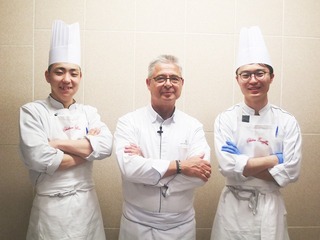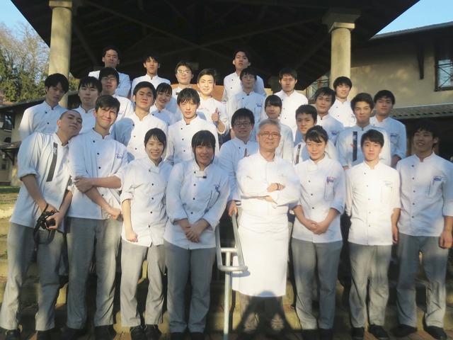 少し緊張した面持ちの研究生。シェフと一緒に記念撮影。