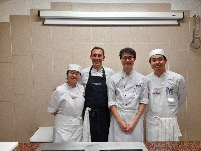 シェフを囲んで、助手を務めた研究生2名と研修生。※撮影時にマスクを外してもらいました。