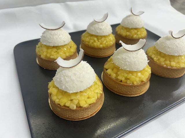 サクッとしたタルト生地の中に、アーモンドクリームとカスタードクリームを混ぜ合わせたものを絞りタルト生地と一緒に焼き、レモンのクリーム、フレッシュのパイナップル、ライムの皮を飾り、上には、ココナッツのムースを乗せて仕上げています。名前にあるピニャ・コラーダとはラム酒をベースにしたカクテルで、そのカクテルをイメージして作られています。フレッシュのパイナップルの爽やかさをライムがさらに際立たせており、甘い香りのココナッツとも合うバランスの良いお菓子です。