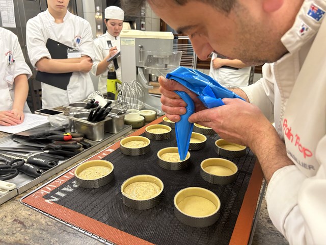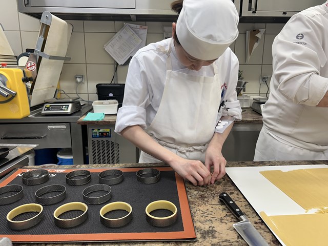 ランジリエ氏はアシスタントを務める学生に丁寧に教えながらたくさんの作業をさせてくださいます。タルト生地の敷き込み、クリームを炊くところも挑戦です!