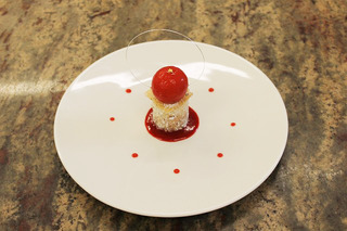 飾りにイチゴのソースやアメ細工を使用して、見た目も華やかに、甘酸っぱさとパリパリとした食感が絶妙です。