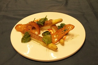 Les Asperges(Vertes ou Blanches) utiles minutes, croûtées à la Noix de Pécan, blanc manger aux Herbes, vinaigrette de carotte au Savagnin, croustillant de pain...