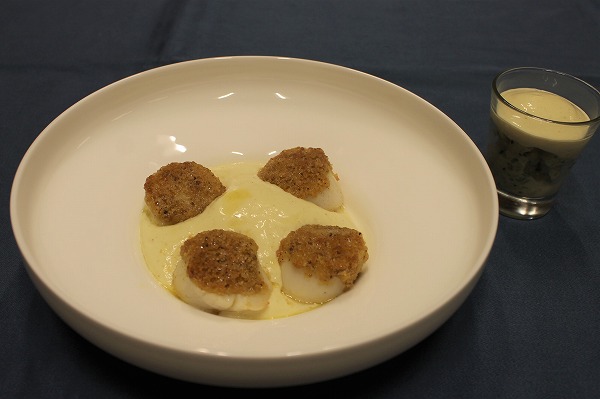 ホタテをヘーゼルナッツオイルでマリネし、その上にペカンナッツ、バター、パンを合わせたクルート生地をのせ表面を香ばしく焼き上げます。
