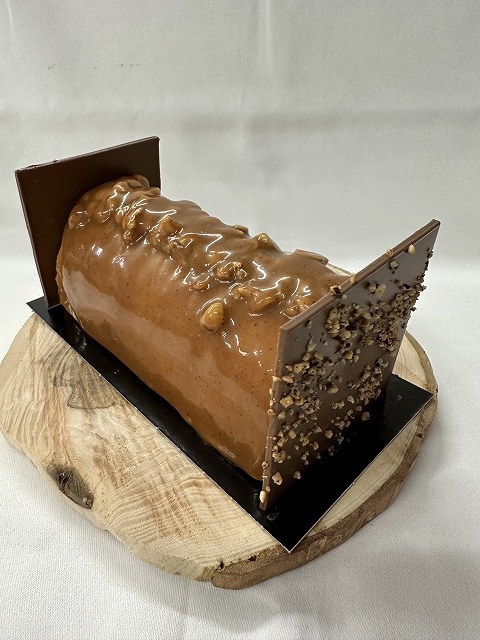 作っていただくお菓子の名前は「Noisette(ノワゼット)」。ダコワーズノワゼット、プラリネピエモン、クレミュー・ジャンドゥジャピエモン、ムース・プラリネピエモン、とすべてのパーツにヘーゼルナッツが使われています。イタリアのピエモンテ州がヘーゼルナッツの産地なので生地やクリームの名前によくピエモンと付けられます。お菓子の形はフランスのクリスマスシーズンによく見かける形、ビュッシュ(薪)です。