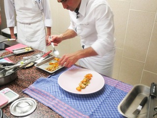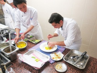 上手くコミュニケーションをとりながら、研修生と一緒に料理を仕上げていきます。バルベ氏は研究生の慣れないフランス語に耳を傾け親身に質問に答えて頂きました。講習後には、料理に興味を持ち、食べ歩きや、本を読むなど色々と勉強し、フランス語をどうにか話そうとしていることが、素晴らしいとおっしゃっていました。