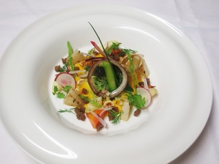 人参のブルーテの上に、食感が残るように火を通したポロねぎ、絹さや、形や味付けを変えた蕪やラディッシュ
