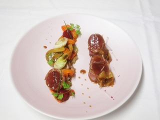 鴨の胸肉を低温調理で、芯温55℃でしっとりと火を通し、相性の良いフランボワーズを使った甘酸っぱいソースで仕上げにラッケ(照りが出るようにソースの中で温める)します。付け合わせも、宿泊客の健康を考えて野菜をたっぷり使用したヌイユ仕立てです。丁寧な味付けと盛り付けに研究生からも質問が多数出ました。