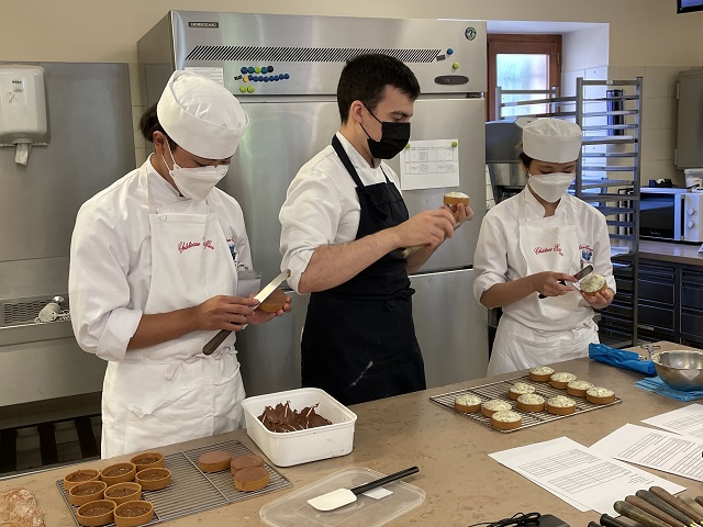 シェフが仕上げているお菓子を見て同じように仕上げをする研究生。