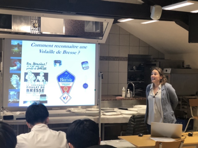 今回の授業は通常の料理講習ではなく食材研究です。フランスが誇る有名なブレスの鶏について説明するため、講師としてブレス鶏生産者組合からカティ・モリエールさんに来ていただきました。