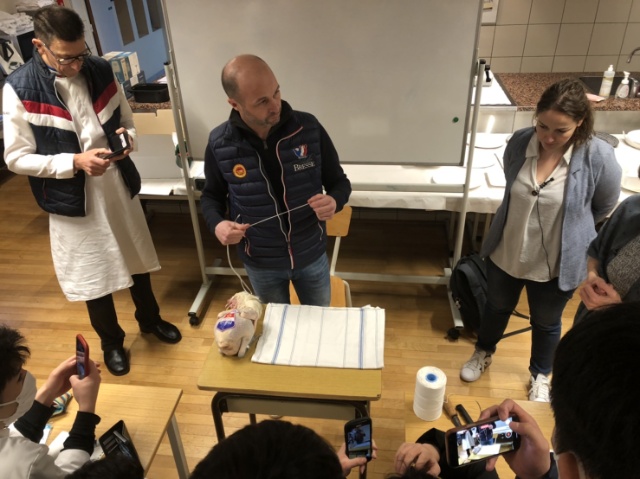 実際にルーラージュを実演して頂きました。ルーラージュ済みの鶏は市場で見たことはありますが、目の前で実際の工程を見ることが出来て研究生は興味深々でした。このようににして空気を抜けば、3週間の保存が可能となります。