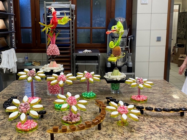 パティシエである奥様も一緒に来校され、クライン氏の講習と同時進行でプレゼンテーション用の飴細工を作ってくださり、飴細工とコンフィズリーを一緒に飾っていただきました。