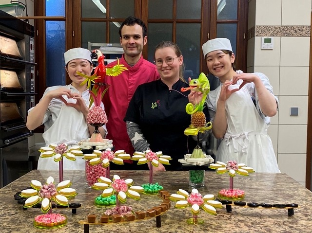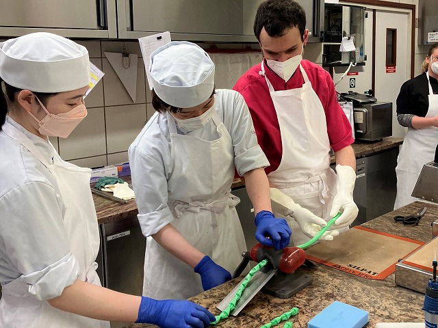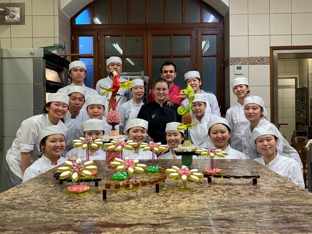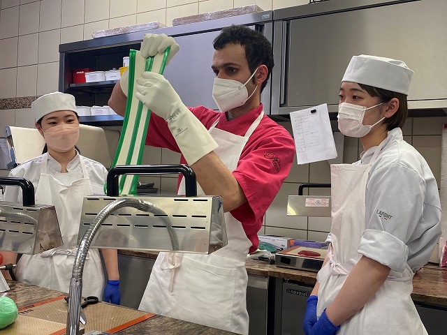 「2度目のアシスタントでしたが、前回よりフランス語を使用しての会話が出来るようになり、シェフとコミュニケーションをとりながら作業をする事が出来ました。またお菓子(糖菓)作りにおいて初めて見る技法もたくさんあり、とても面白い授業でした。」