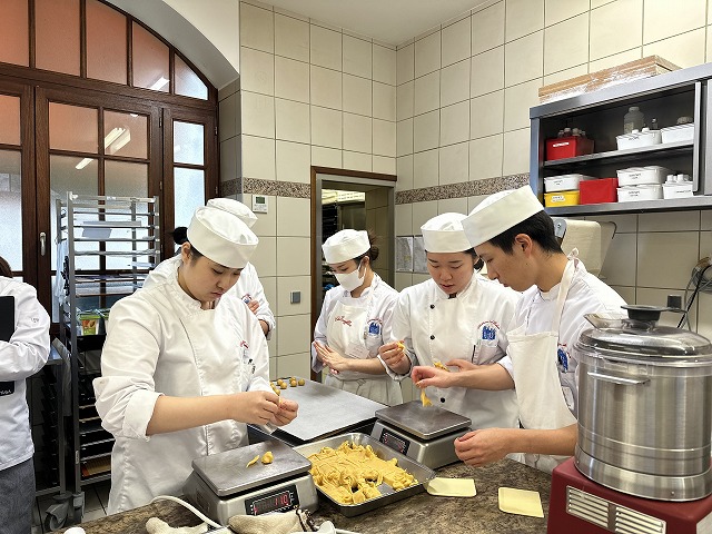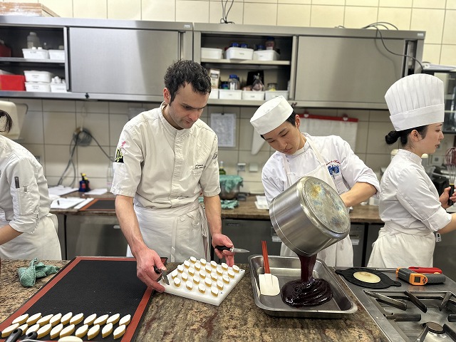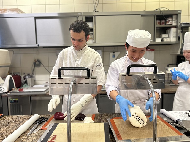 研究生達はフランス語を聞き取り、任された作業をシェフに確認しながらお菓子を仕上げていました。