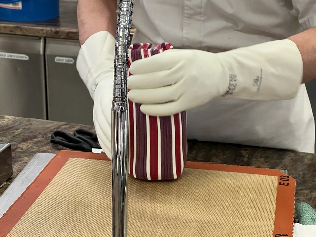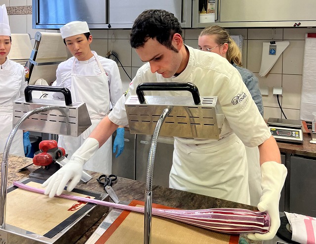 ボンボン・ロックは、"KLIEN"の文字が崩れないように、研究生が飴を転がしながら、シェフはリボンの飴を引いて一緒に作業を行っていました。憧れのシェフの隣で作業ができ、嬉しそうですね!