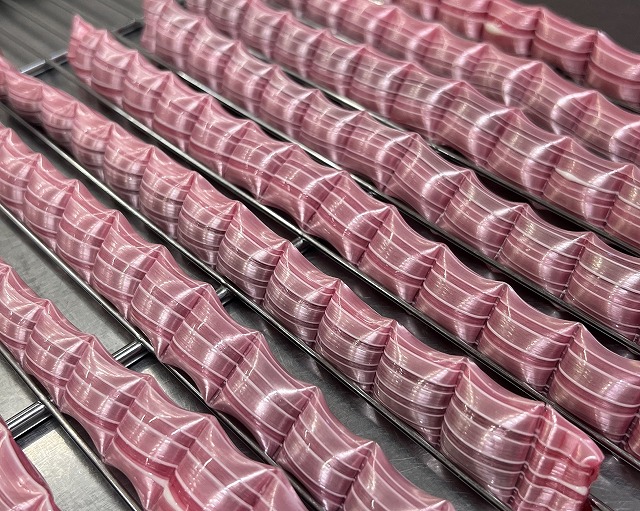 これらのキャンディは太い円柱状の飴を細い棒状にした後、機械・押し型・ナイフでカットします。切り方の違いでそれぞれ形が異なるキャンディができます。