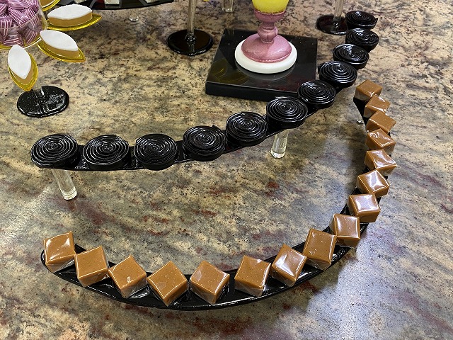 飴で作った文字を飴で覆い、リボン状に引いた飴で包み、細い棒状にしてカットしたキャンディ。飴の中心部に「KLEIN」の文字が入っています。