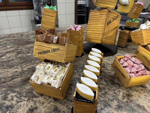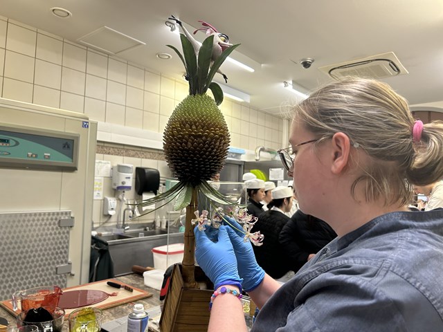 そしてクライン氏がお菓子を作成してくださっている横で奥様が飴細工の方をずっと作成してくださっていました。キング・ジュリアンというWebアニメのキャラクターをモチーフに作成されたそうです。下の部分はパイナップルを表現されています。一つ一つが丁寧で、揃っており、飴細工で一番大事な艶もありますね!最後に全てを飾って今日の講習が終了です!一日かけて様々なフランスの伝統的なコンフィズリーを勉強でき、研究生も楽しそうに作業をしていました。