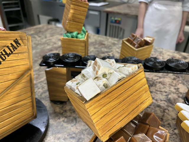 卵白に煮詰めたラベンダーの蜂蜜とシロップを加え泡立て、ナッツ類をたくさん加えた糖菓です。