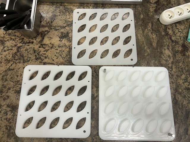 この型は3段になっており、生地を敷き詰めたあと一番上の型を重ねると糖衣を敷きこめるようになっています。最後に一番下の型にはめると綺麗に型からはがすことができます。出来立てはやわらかいマジパンのような状態なので5日ほど室温で乾燥させて完成です。初めて作るカリソンに興味津々でした!