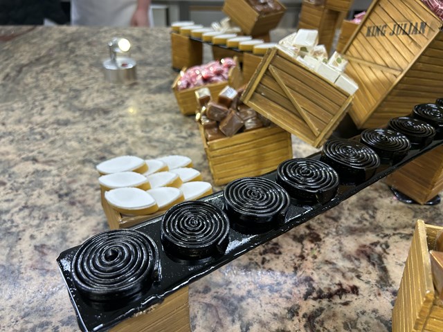 ストライプの四面体の飴のことをベルランゴと言います。今回はミント味ができあがり、ラボ内が爽やかな香りになりました!