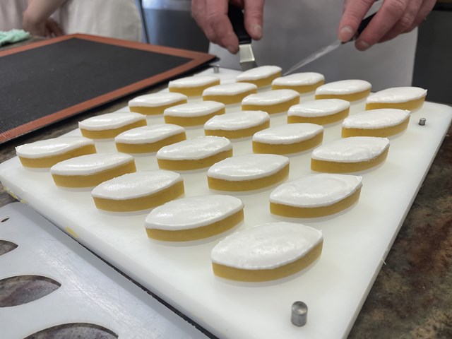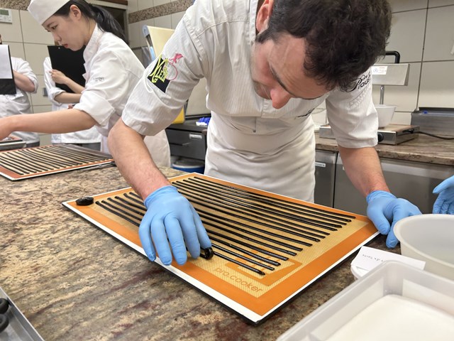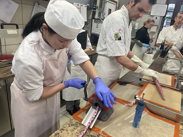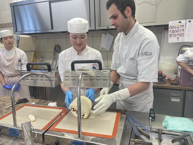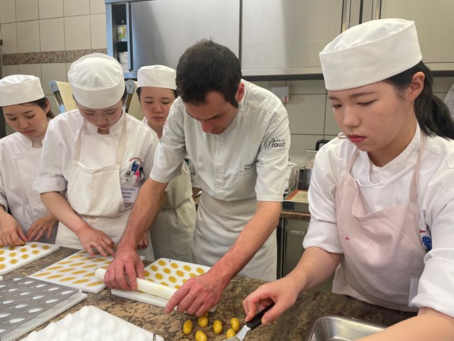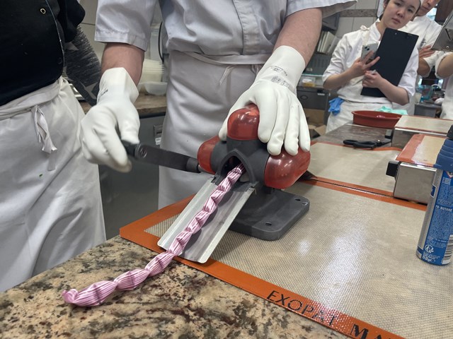 「最近飴細工が終わったこのタイミングで、飴細工で有名なポール・クラインさんの講習を受けました。食べる飴のボンボンを作るのは初めて見ました。クラインさんの隣で作業を見ることが出来てとても嬉しかったです!初めて見る技術や器具を使わせていただき本当にいい経験になりました、特にCalisson d'Aixの作業をする時にTrès bien!と褒めていただいて嬉しかったです。」