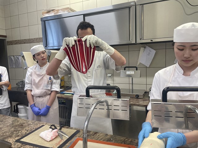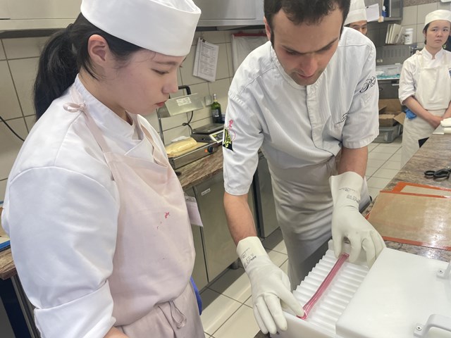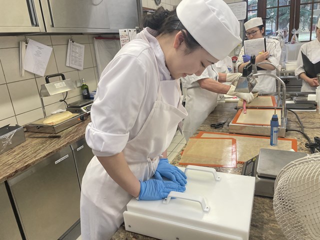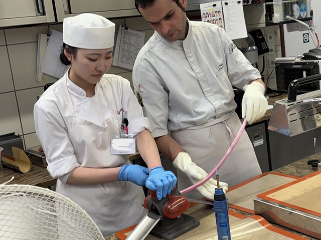 「初めての助手ということもあり始めはとても緊張しましたが、時間が経つにつれてシェフとの講習に慣れ、次は何が必要か、何が要らなくなるかなどを考えて行動することが出来ました。シェフは何でも一人で効率よく作業が出来るので、自分はどこで間に入ることが出来るのか考えて動くことが出来ました。飴を転がしたり、普段あまり見かけない飴をカットする作業が面白くて1番印象に残りました。」