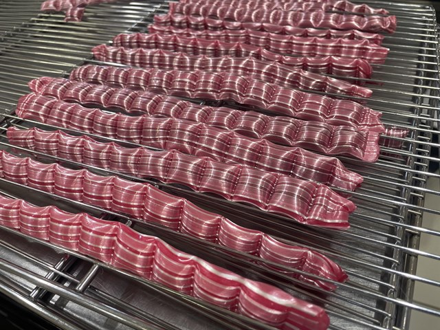 出来上がった生地を温かいうちに素早く絞ります。ゼラチンが多く入っているため、冷めるとすぐ固まります。それを端から一つ一つ丁寧に巻いていくと完成です。
