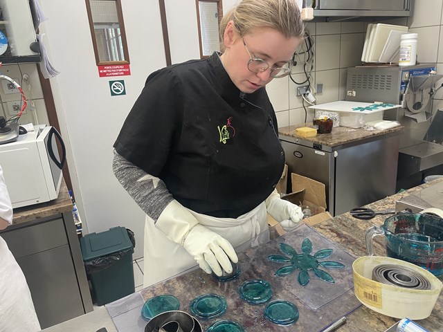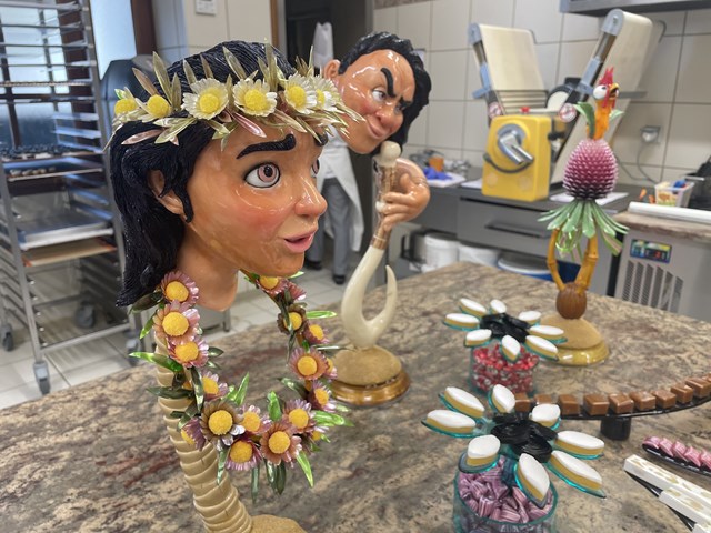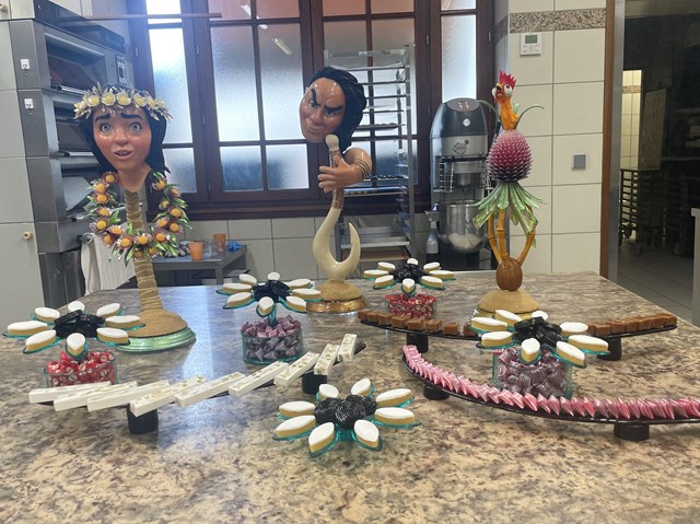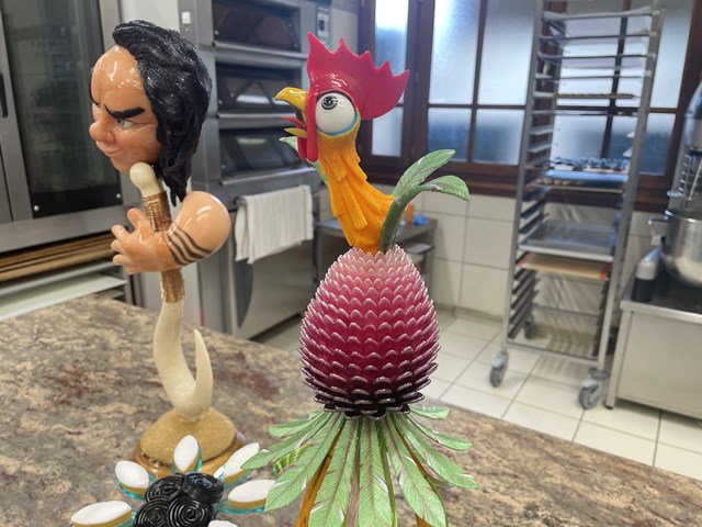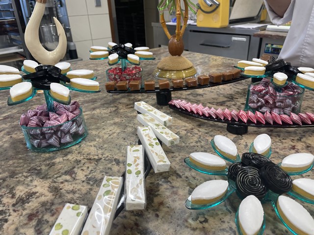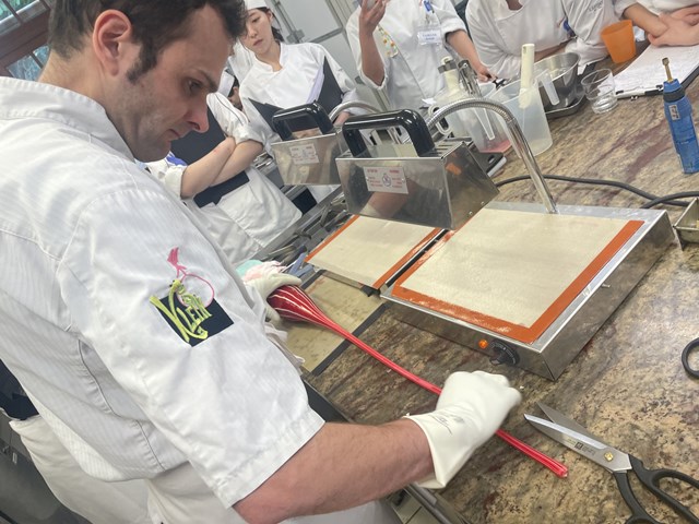 そして講習を行っている隣のテーブルでは、クライン氏の奥様がプレザンテで使用する飴細工を作成してくださっています。そちらを使用し、いよいよ作ったものを全て飾っていきます!