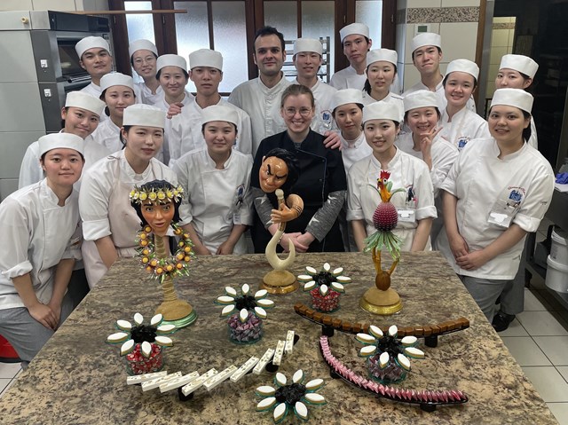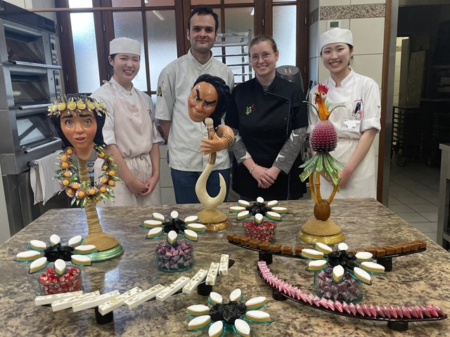 フランス東部のベルフォールにある「パティスリー・ショコラトリー・クライン」で働かれています。ポール氏の父であるStéphane KLEIN(ステファン・クライン氏)は飴細工の第一人者として有名で、数々の本も執筆されています。息子のポール氏も同様細工を得意としており、飴やショコラ、パスティヤージュを使用したピエスモンテと、アントルメを作成する世界大会のコンテストである『Charles Proust(シャルル・プルースト杯)』では、2012年21歳という若さで見事優勝しています。今の研究生達とほぼ同じ年齢での世界チャンピオンは、より凄さを実感しますね!