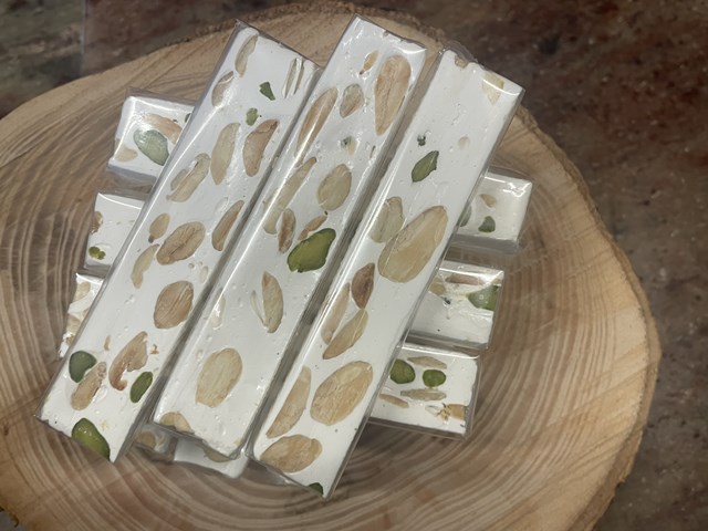 泡立てた卵白にシロップやラベンダーの蜂蜜を加え混ぜ、ナッツをたくさん加えた糖菓です。