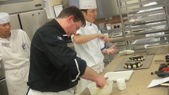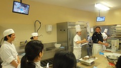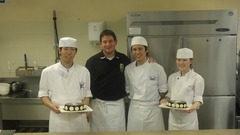 研修生の外山君はシェフとしっかりとコミュニケーションを取りながら助手を務め、時折シェフとにこやかに話しをする姿もありました。シェフも「彼はいつも笑顔でとても感じがいい。何よりも笑顔で元気に仕事をすることが大事。」とおっしゃっていました。そんな外山君の姿は、研修中のコミュニケーションの取り方の良い勉強になったと思います。