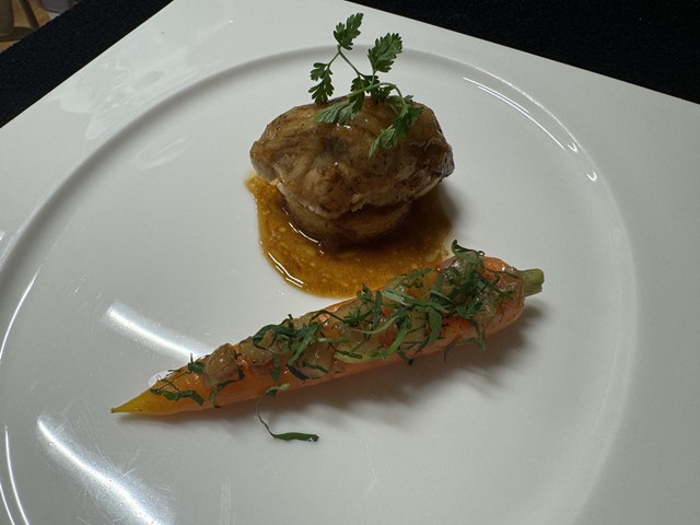 Ris de Veau clouté, de Comté aux parfums de Mélilot Carotte jaune Doubs glacée et éclats de Châtaignes