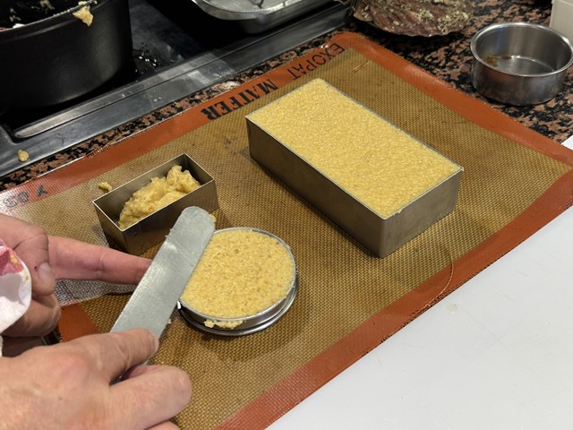 つけ合わせは2種類です。1つ目はエシャロットのみじん切りをバターで炒めて鶏のだし汁を加えて沸騰させます。そこにトウモロコシの粉とsemoule de Gaudes(スムール・ド・ゴード)と呼ばれる、炒ったトウモロコシの粉を細引きにしたものを加えてオーブンに入れて粉に火を通します。仕上げにコンテチーズを加えてから型に流し入れて冷やし固めます。