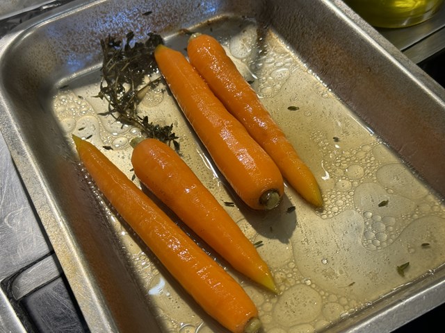 2つ目は葉付きにんじんの皮をむいて、バットに鴨の脂、にんじん、塩、タイム、キャラウェイシードのパウダーを入れます。アルミホイルで蓋をしてオーブンでにんじんに火を通します。