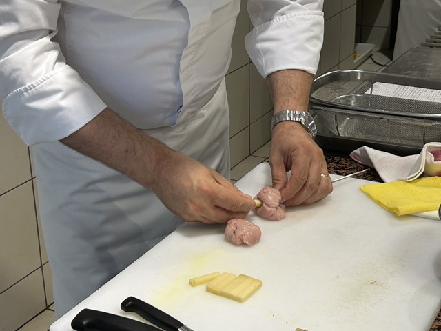 コンテチーズを使用した料理ではメイン食材としてリ・ド・ヴォという子牛の胸腺肉を使用しました。リ・ド・ヴォというのは子牛の頃にしかなく、成牛になるにつれなくなっていく内臓の部位になります。レバーのような臭みは無く濃厚でミルキーな味わいです。そのリ・ド・ヴォに今回は棒状に切ったコンテチーズを差し込みます。