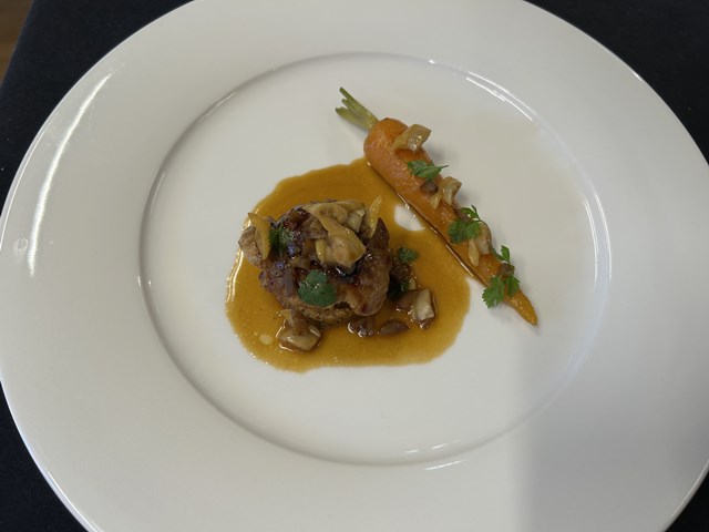 そして、形を崩さないように網脂で巻いたものを低温のオーブンでじっくりと火を通し、仕上げにバターで表面を焼き、しっかりきれいな焼き色をつけていきます。この最後にバターで焼く際のポイントですが、多くの日本人はバターを使う量が少ない傾向にあるので、バターはたっぷり使用することが大切だとおっしゃっていました。こうすることで、美味しそうな焼き色と香りが付いて、食欲をそそります。
