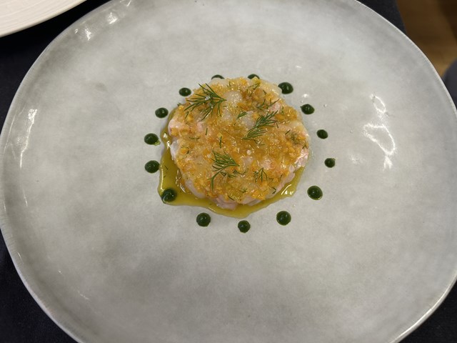 次にラングスティーヌの料理です。ラングスティーヌとは日本語名であかざえびを指します。日本では駿河湾などが産地になっていますが、なかなか見ることがない食材です。このえびはとにかく甘みが強く、全く臭みもありません。そんなラングスティーヌを今回はカルパッチョ仕立てにしていきました。ラングスティーヌは1尾を約4等分にし、セルクルに詰めてしっかりと冷やしておきます。カルパッチョのソースとして、ホワイトバルサミコ酢、柑橘類の皮(今回はオレンジ、レモン、ライム)の角切り、生姜、エシャロットを加えて煮詰めます。シロップ状まで煮詰まったところに柑橘類の液体を加えてさらに煮詰めて旨味を凝縮し、味をなじませてから冷やします。仕上げにオリーブオイルとディルを加えて完成です。盛りつけはラングスティーヌの両面にソースを流し、周りに香草のピューレやディルを飾り、完成です。作り方はシンプルですが、ホワイトバルサミコ酢の酸味と柑橘類の香りが効いており、見た目も色鮮やかで、季節感を感じる美しい1皿でした。