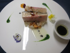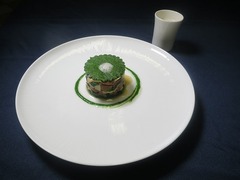 オンブル・シュバリエ(アルプスイワナ)という淡水魚とジュラワイン(シャトー・シャロン)を使った1品です。オンブル・シュバリエに海苔を挟み、ジュラワインをエシャロットで作った合わせバターを表面に塗り火を入れました。非常にデリケートな魚なので火入れには、かなり気を配っているそうです。