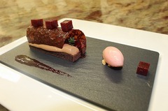 チョコレート生地にチョコレートクリームを両端に絞り、その間にチェリーのコンフィを。上には、焼いたあと熱いうちに切って丸くカーブさせた、パリっとしたチョコレートの生地に、四角に切ったチェリーのジュレ。横にはグレープフルーツのソルベが抜いてあります。