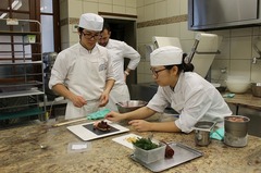 今回助手を努めてくれたのは、製菓研究課程の杉村真由さんと菅原嗣生君。シェフの指示を聞き取り、生地やジュレを一緒に作ったり、盛り付けを任せてもらったりと、たくさんの作業をこなしてくれました。